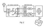 FIG. 2 is a block diagram depicting a sensor120 incorporating a software-defined radio receiver in accordance with one or more embodiments presented herein. Anantenna210 may receive aradio frequency signal215. Theradio frequency signal215 may be coupled into a radio frequencyfront end220. The radio frequencyfront end220 may condition theradio frequency signal215 to generate an analog output signal. The analog output signal may comprise in-phase and quadrature components referred to as I and Q signals. The analog output from the radio frequencyfront end220 may be coupled to adigitizer230. The digitizer can output data that is a digital representation of the analog output generated by the radio frequencyfront end220. The digital representation may be sampled in time and quantized in amplitude. The digital representation may also comprise separate I data and Q data. A rawsignal analysis engine240 may receive and process the raw digital representation generated by thedigitizer230. A rawsignal analysis output250 may be the results of processing associated with the rawsignal analysis engine240. The rawsignal analysis output250 may be communicated onto thenetwork150 for further processing.