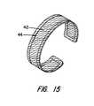 FIG. 15 shows yet another way of implementing the partial banding of a fluid carrying tubular organ to increase its resistance to flow. Here, apolypropylene mesh strip42 is supported by aframe member44 formed from a suitable metal or plastic exhibiting a memory property when stressed below its elastic limit and then released. Without limitation, the frame may comprise a nitinol wire that has been heat treated in a mold to form the C-shape configuration illustrated inFIG. 15. When the band is spread, placed about a tubular organ and then released, the mesh strip is brought into intimate engagement with the tubular organ and over a few-week period becomes endothelialized, thus reinforcing the organ wall at the placement site.