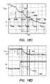For ISFET transient response, a stepwise change in the concentration of one or more ionic species in the analyte solution in turn essentially instantaneously changes the charge density σdlon the analyte solution side of the double layer capacitance Cdl. Because the instantaneous change in charge density σdlis faster than the reaction kinetics at the surface of thepassivation layer72, the surface charge density σ0initially remains constant, and the change in ion concentration effectively results in a sudden change in the double layer capacitance Cdl. FromEquation 10, it may be appreciated that such a sudden change in the capacitance Cdl. at a constant surface charge density σ0results in a corresponding sudden change in the surface potential T0.FIG. 2A illustrates this phenomenon, in which an essentially instantaneous or stepwise increase in ion concentration in the analyte solution, as shown in the top graph, results in a corresponding change in the surface potential Ψo, as shown in the bottom graph ofFIG. 2A. After some time, as the passivation layer surface groups react to the stimulus (i.e., as the surface charge density adjusts), the system returns to some equilibrium point, as illustrated by the decay of the ISFET response “pulse”79 shown in the bottom graph ofFIG. 2A. The foregoing phenomenon is referred to in the relevant literature (and hereafter in this disclosure) as an “ion-step” response.