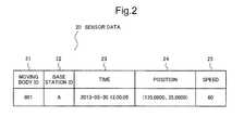 Themoving body ID21 represents an ID that identifies the movingbody00. Thebase station ID22 represents an ID of a base station that the movingbody00 uses for communication. Thetime23 represents a time when thesensor04 records theposition24 and thespeed25. Theposition24 represents a position of the movingbody00, for example, longitude and latitude. When the movingbody00 is an airplane, theposition24 may include an altitude. Thespeed25 represents a moving speed of the movingbody00.