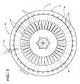 According to an aspect, thestage section38 of theturntable32 can include a plurality oftrays42. In one example, the defined plurality oftrays42 may consist of exactly thirty-eight trays. Depending upon the game of chance to be played, however, the defined plurality oftrays42 can be varied to include more than or less than the exemplary thirty-eight trays illustrated here. Thetrays42 can be equally circumferentially spaced apart one from another about the central axis A. In other words, in this exemplary aspect where thirty-eighttrays42 are provided, each tray occupies a sector of approximately 9.47 degrees. If the number oftrays42 were decreased to thirty-six, for example, eachtray42 would occupy a sector of exactly 10 degrees, and so forth. Thetrays42 may, as shown in the FIGs, comprise narrow slots arranged along radials extending from the central axis A. Each slot may be sized, shaped and oriented so as to hold asingle playing card44 in a vertically upstanding orientation. It will be appreciated that the configuration of the slots and trays may vary. Also, the cards can be retained in the slots a variety of other suitable ways and in a variety of different orientations. It will be appreciated that the cards may be disposed on the turntable in other ways or arrangements.