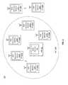 FIGS. 3A and 3B illustrate two examplespatial reuse configurations300,350 consistent with the present disclosure.Reuse configuration300 illustrates a 7 cell reuse plan and reuseconfiguration350 illustrates a 3 cell reuse plan. In C-D2D DR, spatial reuse may be improved by discovery region planning between different cells. Since the DR is allocated by an eNB, an eNB, e.g.,eNB202, may be configured to allocate different RBs in frequency among nearby eNBs. An eNB may be configured to communicate with nearby eNBs (not shown in the Figure) via, e.g., an element manager (e.g.,element manager104 ofFIG. 1). When distances between eNBs are relatively small, higher reuse may be implemented, e.g., the 7 cell reuse plan as shown inreuse configuration300. A group of seven cells may include, for example,cells1A, . . . ,7A. For example, if NfRBs are used for discovery zone, then each frequency grouping (e.g.,cells1A through1F) may use Nf/7 RBs. In another example, if the distance between eNBs is relatively large, 3 cell reuse allocation may be implemented as shown inreuse configuration350. Each frequency grouping (e.g., cells31A through31F) use Nf/3 non-overlapping resources. For example, eNBs associated with cells31A through31F may be configured to allocate RBs1-3, eNBs associated with cells32A through32F may be configured to allocate RBs4-6 and eNBs associated withcells33A through33F may be configured to allocate RBs7-9 of a C-D2D DR. Thus, a likelihood of collisions may be reduced for UEs operating near cell boundaries. The idle mode UEs, e.g., UE208A,208B, may be configured to use the discovery resources allocated by its camping eNB, e.g.,eNB202.
