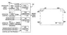 FIG. 20 generally illustrates in diagrammatic form a system for providing an electronically generated display of the optical image that is passed by theobjective lens unit48 andzoom lens unit60 toimaging device50. An endoscope video signal derived from imagingdevice50 is processed by conventional video circuits identified generally at200 to provide signals that are applied to aTV monitor204 so as to cause the latter to reproduce as a TV image the optical image seen by the endoscope's objective lens unit. Thevideo circuits200 and the circuits hereinafter described are preferably embodied in display module140 (FIG.12). The signal processing video circuits may take various forms known to persons skilled in the art and do not constitute part of the present invention. Suffice it to say that the optical image is reproduced with a magnification and field of view determined by the position of the zoom lens unit and a focusing accuracy determined by the position ofimaging device50 along the endoscope's optical axis.