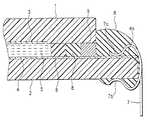When such a mold, or coating, is applied, the hardening and shrinking of the mold resin usually pulls the edges of the top and bottom substrates closer, deforming them inward. As a reaction to this phenomenon, the space between the top and bottom substrates becomes wider toward the middle of sealingmaterial6, causing negative pressure inside, and as a result, low-temperature air bubbles and shock air bubbles tend to occur inside the liquid crystal layer.