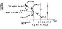 Therefore, when the vertical component of the MV is 1, the vertical component of the MV adj becomes −0.5. When this is applied to the positional correction for correcting the positions of the (M−1)-th field to the positions of the (M−2)-th field, a (M−1, 2) in the (M−1)-th field is corrected to the position of (M−2, 2.5) in the (M−2)-th field, as shown in FIG.1. After the above operation, the position of (M−2, 2) which is the determined value of motion compensation of the a (M, 1) is obtained from pixel values of the (M−2)-th field and the (M−1)-th field which is the result of a time positional correction. In this case, when a necessary pixel value is to be obtained by a weighted average, which is inversely proportional to a distance, from near-by pixel values, for example, the pixel value at the position of the (M−2, 2), that is the determined value of motion compensation of the a (M, 1), is obtained by the following expression:
