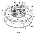 For theactuation device20, each cam follower bearing50 that includes theroller51, as shown best inFIGS. 3 and 5 and described above, is shown as mounted on to ashaft54. Eachshaft54 is fitted through each of threeposts52 that extend at right angles outwardly at equidistance radial distance intervals from one another around the center of theundersurface22 of theactuator cover plate21. Eachpost52, as shown, is preferably formed at a flat section having a regular pyramid profile is connected to the actuator cover plate undersurface along its base and has a rounded apex that includes ahole53 formed therethrough, as shown best inFIG. 5, that receives ashaft54 fitted therethrough. Eachshaft54 preferably includes a broad flathead end55, and is press fitted throughhole53 throughpost52 to receive aconnector56 fitted thereover. Theshaft54 is part of the cam follower bearing50, that includesroller51 and is journaled to turn freely on the sealedneedle bearing58, as shown in broken lines in FIG.5.