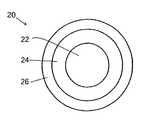 In coatedoptical fiber20,primary coating24 is surrounded bysecondary coating26. While inFIG. 1, the secondary coating is shown as being applied directly to the primary coating, the skilled artisan will recognize that there may be one or more intermediate coating layers deposited between the primary coating and the secondary coating.Secondary coating26 is formed from a cured polymeric material, and typically has a thickness in the range of 20-35 μm (e.g. about 27.5 μm). The secondary coating desirably has sufficient stiffness to protect the optical fiber; is flexible enough to be handled, bent, or spooled; has low tackiness to enable handling and prevent adjacent convolutions on a spool from sticking to one another; is resistant to water and chemicals such as optical fiber cable filling compound; and has adequate adhesion to the coating to which it is applied (e.g. the primary coating).