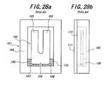 FIG. 28(a) andFIG. 28(b) show a plan view and a side view of aquartz crystal unit101 with the conventional flexural mode, tuning fork,quartz crystal resonator100. Theresonator100 comprisestuning fork tines102,103 andtuning fork base104. Thebase104 is fixed at amounting portion106 of acase105 byadhesives107,108 or solder. Also,electrodes109 and110 are disposed on themounting portion106 and two electrode terminals are constructed. In addition, thecase105 and thelid111 are connected via ametal112. The conventional quartz crystal unit is constructed like this, and it is also needed to miniaturize a tuning fork, quartz crystal resonator to obtain a miniaturized quartz crystal unit with it.