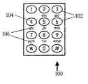 FIG. 1 depicts akeypad100 in a default display state wherein twelvekeys102 are arranged in four rows of three keys. Each key has aprimary character104 and a plurality ofsecondary characters106 associated with it. Theprimary character104 displayed on eachkey102 is, in this embodiment, selected from the group ofcharacters 1, 2, 3, 4, 5, 6, 7, 8, 9, 0, # and *. Thesecondary characters106 associated with each key are shown in groups adjacent the respective key. The secondary character groupings in this embodiment are similar to those of the multitap method, for example the key associated with primary character “2” has an associated secondary character grouping “abc”, the key “3” the associated secondary characters “def” and so on as shown in the figure. Hence, the default display state of thekeypad100 as shown inFIG. 1 presents to the user a keypad having a well known key and character layout, thereby necessitating little or no familiarisation.