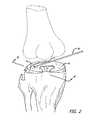 FIG. 2 is a perspective view of the human knee joint showing the rivet of the present invention being passed through the meniscus and capsule.