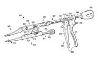 Now referring toFIG. 9a-9c, the pistol grip portion of the instrument can be adapted to provide rotation. This pistol grip can rotate and then lock into one of three positions.FIG. 9a shows the pistol grip in the 0 degree position.FIG. 9b shows the pistol grip in the 90 degree position.FIG. 9c shows the pistol grip in the 180 degree position. Now referring back toFIG. 8b, preferably, locking of the rotatable pistol grip is accomplished by a lockingsleeve551.