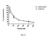 The IC50for Dp5R (i.e., the D form of peptide GGGY-p5R) was unknown and the IC50for p5 (i.e., CGGY-p5) had previously been determined using plaque assay (48). Both peptides were tested using the HCMV expressing luciferase virus. The peptide was tested on MRC-5 cells at the following concentrations: 10 μM, 50 μM, 100 μM, 150 μM, 200 μM, 250 μM. The IC50for p5 is ˜60 μM and the IC50for Dp5R is ˜75 μM (FIG. 5). The IC50values for both the peptides are relatively similar suggesting that the peptides have comparable inhibition of viral infection in vitro.