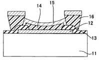 この画素規制部は、SiO2、SiN、SiON、Al2O3、AlN等の絶縁性の無機物、もしくはポリイミド等の有機材料が用いられる。ただし、膜厚が上記のように極めて薄い領域になった場合、無機材料を用いる方が絶縁破壊等に対して有利である。無機材料は上記の他にピンホール等がなく絶縁性に優れたものであれば適用可能である。The pixel restricting portion is made of an insulating inorganic material such as SiO2 , SiN, SiON, Al2 O3 , or AlN, or an organic material such as polyimide. However, when the film thickness becomes an extremely thin region as described above, using an inorganic material is advantageous to dielectric breakdown and the like. Inorganic materials other than those described above can be used as long as they have no pinholes and the like and are excellent in insulation.