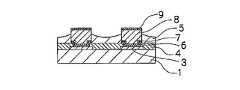 その後、残りのレジスト12を除去し、Cuバンプ8の下以外に形成されている密着層6と接着層7とをウェットエッチング法等を用いて除去する。こうして、本実施の形態に係る半導体装置に用いられる半導体素子1及び基板2を得ることができる。これらは、平坦化されたCuバンプ8の接合面上にAuからなる接合材料9が設けられた態様で得られる〔図2D〕。Thereafter, the remaining resist 12 is removed, and theadhesion layer 6 and theadhesion layer 7 formed other than under the Cu bumps 8 are removed using a wet etching method or the like. Thus, thesemiconductor element 1 and thesubstrate 2 used in the semiconductor device according to the present embodiment can be obtained. These are obtained in a mode in which abonding material 9 made of Au is provided on the bonding surface of the planarized Cu bump 8 [FIG. 2D].