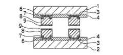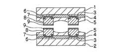 その後、対向する電極部の接合材料9,9面が全て接触する程度に加圧し、両方のCuバンプ8と接合材料9を所定の温度以上に加熱する。ここで、加熱方法は、基板側を常温又はCuとAuとの反応が急速に進行しない程度の予備加熱とし、半導体素子1側よりCuとAuを反応させるための加熱を行ってもよい。Thereafter, pressurization is performed so that the surfaces of thebonding materials 9 and 9 of the opposing electrode portions are all in contact with each other, and both the Cu bumps 8 and thebonding material 9 are heated to a predetermined temperature or more. Here, as the heating method, the substrate side may be preheated to room temperature or to the extent that the reaction between Cu and Au does not proceed rapidly, and heating for reacting Cu and Au from thesemiconductor element 1 side may be performed.
