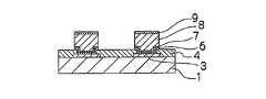 更に、無電解めっき法等を用いてバンプ8にAuからなる接合材料9を形成する〔図4E〕。ここで、無電解めっき法で行う場合は、置換Auめっき浴を用いて所望のめっき厚のAuを形成することができる。また、置換Auめっき浴にてAu薄膜を形成した後、置換と還元の併用型のAuめっき浴を用いて所望のめっき厚のAu薄膜を形成してもよい。Further, abonding material 9 made of Au is formed on thebumps 8 by using an electroless plating method or the like [FIG. 4E]. Here, when the electroless plating method is used, Au having a desired plating thickness can be formed using a substitution Au plating bath. Alternatively, after forming an Au thin film in a substitution Au plating bath, an Au thin film having a desired plating thickness may be formed using a combination of substitution and reduction type Au plating bath.