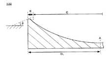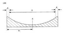 中心部Cは、略楕円弧をなす断面形状を有する。周辺部Eは、中心部Cから滑らかに連続して形成されるが、径方向の傾きの変化が中心部Cとは異なる。The central portion C has a cross-sectional shape that forms a substantially elliptic arc. The peripheral part E is formed smoothly and continuously from the central part C, but the change in the radial inclination is different from that of the central part C.