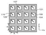 本図に示す例において、第1開口104及び配線106、並びに第2導体パターン111のうちこれらに対向する領域を含む単位セル107が構成されている。図9及び図10に示す例では、単位セル107は、平面視において2次元配列を有している。より詳細には、単位セル107は、格子定数がaである正方形の格子の格子点それぞれに配置されている。このため複数の第1開口104は、中心間距離が互いに同一となるように配置されている。In the example shown in the figure, aunit cell 107 including a region facing thefirst opening 104, thewiring 106, and thesecond conductor pattern 111 is configured. In the example shown in FIGS. 9 and 10, theunit cell 107 has a two-dimensional array in plan view. More specifically, theunit cell 107 is arranged at each lattice point of a square lattice having a lattice constant a. For this reason, the plurality offirst openings 104 are arranged such that the distance between the centers is the same.
