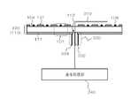 この構造体110は、誘電層(例えば誘電体板)を介して対向している2層の導体層により構成されており、第1導体としての第1導体パターン121、第2導体としての第2導体パターン111、複数の第1開口104、及び複数の配線106を備えている。第1導体パターン121は、例えばシート状である。第2導体パターン111は、例えばシート状であり、第1導体パターン121に少なくとも一部(ただしほぼ全体であってもよい)が対向している。複数の第1開口104は第1導体パターン121に設けられている。配線106は、複数の第1開口104それぞれの中に設けられており、一端が第1導体パターン121に接続している。そして第1開口104及び配線106を含む単位セル107が繰り返し、例えば周期的に配置されている。単位セル107が繰り返し配置されることにより、構造体110はメタマテリアル、例えばEBG(Electromagnetic Band Gap)として機能する。Thestructure 110 includes two conductive layers facing each other with a dielectric layer (for example, a dielectric plate) interposed therebetween. The firstconductive pattern 121 as the first conductor and the second conductive layer as the second conductor. Aconductor pattern 111, a plurality offirst openings 104, and a plurality ofwirings 106 are provided. Thefirst conductor pattern 121 has a sheet shape, for example. Thesecond conductor pattern 111 has, for example, a sheet shape, and at least a part (but may be substantially the whole) of thefirst conductor pattern 121 faces thefirst conductor pattern 121. The plurality offirst openings 104 are provided in thefirst conductor pattern 121. Thewiring 106 is provided in each of the plurality offirst openings 104, and one end thereof is connected to thefirst conductor pattern 121. Theunit cells 107 including thefirst openings 104 and thewirings 106 are repeatedly arranged, for example, periodically. By repeatedly arranging theunit cells 107, thestructure 110 functions as a metamaterial, for example, EBG (Electromagnetic Band Band Gap).