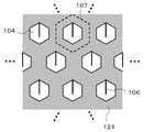 なお、図2(a)は正方形の第1開口104を正方格子状に周期配列する例を示しているが、第1開口104のレイアウトは図2(a)の正方形に限ることはない。例えば、正六角形の第1開口104を正六角形のような多角形にしたりや円形にすることも可能である。また第1開口104を三角格子状に配置しても良い。2A shows an example in which the squarefirst openings 104 are periodically arranged in a square lattice shape, the layout of thefirst openings 104 is not limited to the square in FIG. 2A. For example, the regular hexagonalfirst opening 104 may be a polygon such as a regular hexagon or a circle. Thefirst openings 104 may be arranged in a triangular lattice shape.