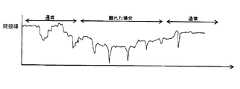 フィルタ部13は、開眼幅計測手段により計測された開眼幅の時系列トレンドを追跡する。図2は、フィルタ部13の出力例を示す。実線hで示される値が開眼幅計測部12による実測値であり、破線fで示される値がフィルタ部13による出力値である。本実施の形態では、フィルタ部13として低域濾過フィルタを用いる。低域濾過フィルタのフィルタ特性は、図3に示すように、瞬目の周波数25よりも低い周波数の信号のみが通過するように設定する。これにより、通常の瞬目を閉眼と判定することを防止する。Thefilter unit 13 tracks the time series trend of the eye opening width measured by the eye opening width measuring means. FIG. 2 shows an output example of thefilter unit 13. A value indicated by a solid line h is an actual measurement value by the eye openingwidth measurement unit 12, and a value indicated by a broken line f is an output value by thefilter unit 13. In the present embodiment, a low-pass filter is used as thefilter unit 13. The filter characteristics of the low-pass filter are set so that only signals having a frequency lower than theblink frequency 25 pass, as shown in FIG. This prevents a normal blink from being determined to be closed.