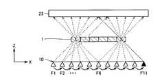 その結果、検査対象1の左端の部分領域には、焦点位置F1~F6から出たX線が透過し、透過したX線がX線検出器23に入射する。検査対象1の右端の部分領域には、焦点位置F6~F11から出たX線が透過し、透過したX線がX線検出器23に入射する。同様に、いずれの部分領域にも、6つの焦点位置から出たX線が透過し、透過したX線がX線検出器23に入射する。そのためF1~F11での撮像で、6つの視野について6方向からの撮像が完了していることとなる。As a result, the X-rays emitted from the focal positions F1 to F6 are transmitted to the left end partial region of theinspection object 1, and the transmitted X-rays enter theX-ray detector 23. The X-rays emitted from the focal positions F6 to F11 are transmitted to the partial region at the right end of theinspection object 1, and the transmitted X-rays enter theX-ray detector 23. Similarly, X-rays emitted from the six focal positions are transmitted to any partial region, and the transmitted X-rays enter theX-ray detector 23. Therefore, in the imaging in F1 to F11, imaging from six directions is completed for six fields of view.