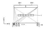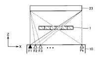 第1の実施の形態と同様、X線源10は、X方向のライン上の互いに異なる複数の焦点位置(図においてF1~Fk)で、X線をZ方向に順次放射する。X線検出器23.1および23.2は、図18にしめす検出位置S1で、一照射毎に透過画像を取得する。As in the first embodiment, theX-ray source 10 sequentially emits X-rays in the Z direction at a plurality of different focal positions (F1 to Fk in the figure) on the line in the X direction. The X-ray detectors 23.1 and 23.2 acquire transmission images for each irradiation at the detection position S1 shown in FIG.