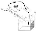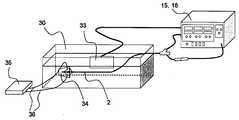 図17に、バルーン表面温度試験系の概略図を示す。水槽30の内壁に貼った対極板33に、高周波発生装置15(撹拌発生装置16が一体化されたもの)を接続して、水槽30に37℃の0.9%生理食塩水を35L入れた。FIG. 17 shows a schematic diagram of a balloon surface temperature test system. A high frequency generator 15 (integrated with the stirring generator 16) was connected to acounter electrode plate 33 attached to the inner wall of thewater tank 30, and 35 L of 0.9% physiological saline at 37 ° C. was placed in thewater tank 30. .