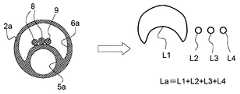 図6は、本発明の第一実施形態に係るバルーン付きアブレーションカテーテル用シャフトの長手方向に対して垂直な断面における、液体供給用ルーメンの形状の輪郭の長さ(La)を説明するための図である。図7は、本発明の第一実施形態に係るバルーン付きアブレーションカテーテル用シャフトの長手方向に対して垂直な断面における、液体供給用ルーメンの形状の輪郭に囲まれる液体供給用ルーメン領域の面積を説明するための図である。FIG. 6 is a view for explaining the length (La) of the contour of the shape of the liquid supply lumen in a cross section perpendicular to the longitudinal direction of the ablation catheter shaft with balloon according to the first embodiment of the present invention. It is. FIG. 7 illustrates the area of the liquid supply lumen region surrounded by the contour of the shape of the liquid supply lumen in the cross section perpendicular to the longitudinal direction of the shaft for the ablation catheter with balloon according to the first embodiment of the present invention. It is a figure for doing.