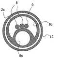 電極4は、バルーン3の内部で、バルーン付きアブレーションカテーテル用シャフト2cに固定される。バルーン内温度測定用の温度センサ7は、電極4に固定される。電極4に接続された高周波通電用のリード線8と、温度センサ7に接続された温度センサ用リード線9とは、図4のA-A’断面を示す図5のように、液体供給用ルーメン6cの中を挿通している。Theelectrode 4 is fixed inside theballoon 3 to theablation catheter shaft 2c with balloon. Atemperature sensor 7 for measuring the temperature in the balloon is fixed to theelectrode 4. Thelead wire 8 for high-frequency energization connected to theelectrode 4 and thelead wire 9 for the temperature sensor connected to thetemperature sensor 7 are for supplying liquid as shown in FIG. 5 showing a cross section AA ′ of FIG. It passes through thelumen 6c.