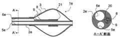 図8に示されるバルーン付きアブレーションカテーテルシステム19のバルーン付きアブレーションカテーテル用シャフト2dは、単一管からなる。バルーン付きアブレーションカテーテル用シャフト2dの先端側にはバルーン3が取り付けられている。また、バルーン付きアブレーションカテーテル用シャフト2dは、バルーン3の内部には連通せずにバルーン付きアブレーションカテーテル用シャフト2dを基端から先端まで貫通するガイドワイヤー通過用ルーメン5dと、バルーン付きアブレーションカテーテル用シャフト2dの基端を貫通し、バルーン3の内部に連通する液体供給用ルーメン6dと、を備える。The balloonablation catheter shaft 2d of the balloonablation catheter system 19 shown in FIG. Aballoon 3 is attached to the distal end side of the balloonablation catheter shaft 2d. Theablation catheter shaft 2d with balloon is not connected to the inside of theballoon 3, and the guidewire passing lumen 5d that penetrates theablation catheter shaft 2d with balloon from the proximal end to the distal end, and the ablation catheter shaft with balloon. Aliquid supply lumen 6d that penetrates the proximal end of 2d and communicates with the inside of theballoon 3.