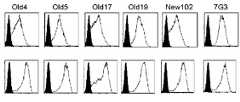 その結果を図3に示す。c7G3抗体は、領域1をGM-CSFRαに置換させたタンパク発現細胞のみにおいて、反応が消失した。Old19は、Aドメイン内の領域2及び領域3、Bドメイン内の領域5及び領域6をGM-CSFRαに置換させたタンパク発現細胞への反応が消失した。New102は、Bドメインの領域5及び領域6をGM-CSFRαに置換させたタンパク発現細胞への反応が消失した。The result is shown in FIG. The response of the c7G3 antibody disappeared only in the protein-expressing cells in whichregion 1 was substituted with GM-CSFRα. In Old19, responses to protein-expressing cells in which regions 2 and 3 in the A domain andregions 5 and 6 in the B domain were substituted with GM-CSFRα disappeared. In New102, the response to the protein-expressing cells in whichregions 5 and 6 of the B domain were substituted with GM-CSFRα disappeared.
