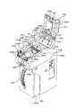 具体的にシャッタ機構5050は、紙幣搬送路5005の紙幣搬送方向と直交する方向に所定間隔おいて出没するように回動駆動される回動片5052と、この回動片5052を回動駆動する駆動源であるソレノイド(プル型)5054とを有している。この場合、回動片5052は、支軸5055の幅方向に2箇所設置されており、紙幣搬送路5005を形成する下部フレーム5002Bの紙幣搬送面5003aには、各回動片5052が出没できるように紙幣搬送方向に延出する長孔5005cが形成されている。Specifically, theshutter mechanism 5050 rotates therotational piece 5052 that is rotationally driven so as to appear and disappear at a predetermined interval in a direction orthogonal to the banknote conveyance direction of thebanknote conveyance path 5005, and rotationally drives therotation piece 5052. And a solenoid (pull type) 5054 as a driving source. In this case, the rotatingpieces 5052 are installed at two locations in the width direction of thesupport shaft 5055 so that therotating pieces 5052 can appear and disappear on thebanknote transport surface 5003a of thelower frame 5002B forming thebanknote transport path 5005. Along hole 5005c extending in the bill conveyance direction is formed.