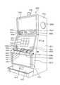 トップボックス1012の前面には、上側画像表示パネル1131が設けられている。上側画像表示パネル1131は、液晶パネルからなり、ディスプレイを構成する。上側画像表示パネル1131は、演出にかかる画像や、遊技の内容の紹介やルールの説明を示す画像が表示される。また、トップボックス1012には、スピーカ1112およびランプ1111が設けられている。スロットマシン1010では、画像の表示、音の出力および光の出力によって演出が実行される。An upperimage display panel 1131 is provided on the front surface of the top box 1012. The upperimage display panel 1131 includes a liquid crystal panel and constitutes a display. The upperimage display panel 1131 displays an image related to the effect, an introduction of the contents of the game, and an image showing the explanation of the rules. The top box 1012 is provided with a speaker 1112 and alamp 1111. In theslot machine 1010, an effect is executed by displaying an image, outputting sound, and outputting light.