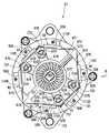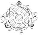 すなわち、U相コイルに接続されるMOS2081を有する半導体モジュール2262と、U相コイルに接続されるMOS2084を有する半導体モジュール2272とは、放熱ブロック2251のパワー回路基板2070側であって径方向外側の辺を挟んで隣り合うように配置されている。同様に、V相コイルに接続されるMOS2082を有する半導体モジュール2263と、V相コイルに接続されるMOS2085を有する半導体モジュール2273とは、放熱ブロック2251のパワー回路基板2070側であって径方向外側の辺を挟んで隣り合うように配置されている。また、W相コイルに接続されるMOS2083を有する半導体モジュール2264と、W相コイルに接続されるMOS2086を有する半導体モジュール2274とは、放熱ブロック2251のパワー回路基板2070側であって径方向外側の辺を挟んで隣り合うように配置される。さらに、電源リレー2087を有する半導体モジュール2261と、電源リレー2088を有する半導体モジュール2271とは、放熱ブロック2251のパワー回路基板2070側であって径方向外側の辺を挟んで隣り合うように配置される。このように配置することにより、配線ロスを少なくすることができる。That is, thesemiconductor module 2262 having theMOS 2081 connected to the U-phase coil and thesemiconductor module 2272 having theMOS 2084 connected to the U-phase coil are on thepower circuit board 2070 side of theheat dissipating block 2251 on the radially outer side. Are arranged adjacent to each other. Similarly, thesemiconductor module 2263 having theMOS 2082 connected to the V-phase coil and thesemiconductor module 2273 having the MOS 2085 connected to the V-phase coil are on thepower circuit board 2070 side of theheat dissipating block 2251 on the radially outer side. It is arranged to be adjacent to each other across the side. Further, thesemiconductor module 2264 having theMOS 2083 connected to the W-phase coil and thesemiconductor module 2274 having theMOS 2086 connected to the W-phase coil are on thepower circuit board 2070 side of theheat dissipating block 2251 on the radially outer side. Are arranged adjacent to each other. Further, thesemiconductor module 2261 having thepower supply relay 2087 and thesemiconductor module 2271 having thepower supply relay 2088 are arranged so as to be adjacent to each other on thepower circuit board 2070 side of theheat dissipation block 2251 with the radially outer side interposed therebetween. . By arranging in this way, wiring loss can be reduced.