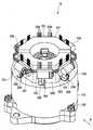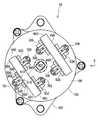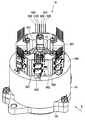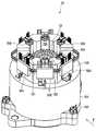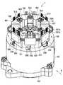 ステータ2020の径方向内側には、ロータ2030がステータ2020に対して相対回転可能に設けられる。ロータ2030は、例えば鉄等の磁性体から筒状に形成される。ロータ2030は、ロータコア2031と、ロータコア2031の径方向外側に設けられる永久磁石2032を有している。永久磁石2032は、N極とS極とが周方向に交互に配列されている。Arotor 2030 is provided on the radially inner side of thestator 2020 so as to be rotatable relative to thestator 2020. Therotor 2030 is formed in a cylindrical shape from a magnetic material such as iron. Therotor 2030 includes arotor core 2031 and apermanent magnet 2032 provided on the radially outer side of therotor core 2031. In thepermanent magnet 2032, N poles and S poles are alternately arranged in the circumferential direction.