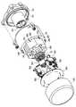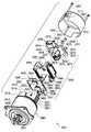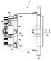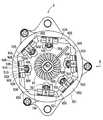 また、シャフト401が電子回路側へ延びている。図4等に示すように、このシャフト401が貫通した状態で、チョークコイル52が配置されている。チョークコイル52は、ヒートシンク601の中心に形成された円柱形状の空間に配置されている。チョークコイル52はドーナツ状の鉄心にコイル線が巻回されてなり、コイル端は、ヒートシンク601の一方の切り欠き部603を通って、径外方向へ引き出されている(図2)。Also, theshaft 401 extends to the electronic circuit side. As shown in FIG. 4 and the like, thechoke coil 52 is disposed with theshaft 401 penetrating therethrough. Thechoke coil 52 is disposed in a cylindrical space formed at the center of theheat sink 601. Thechoke coil 52 is formed by winding a coil wire around a donut-shaped iron core, and the end of the coil passes through onenotch portion 603 of theheat sink 601 and is drawn out in the radially outward direction (FIG. 2).