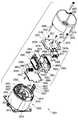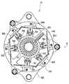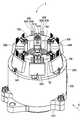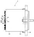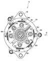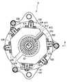 シャフト401が貫通した状態で、チョークコイル52が配置されている(図13)。チョークコイル52はドーナツ状の鉄心にコイル線が巻回されてなる。チョークコイル52のコイル端は、ヒートシンク621の一方の切り欠き部623から径外方向へ引き出されている(図11)。Thechoke coil 52 is disposed with theshaft 401 penetrating (FIG. 13). Thechoke coil 52 is formed by winding a coil wire around a donut-shaped iron core. The coil end of thechoke coil 52 is drawn out from onenotch portion 623 of theheat sink 621 in the radially outward direction (FIG. 11).