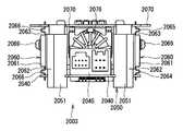 図85等に示すように、ヒートシンク2050は、2つの放熱ブロック2051、及び、2つの放熱ブロック2051の間に設けられる連結部2052を有している。2つの放熱ブロック2051及び連結部2052は、熱伝導性のよい材料(例えばアルミニウム)により一体に形成されている。本実施形態では、放熱ブロック2051は、シャフト2035の軸線を延長した仮想線である中心線よりもモータ2002の径方向外側に設けられる。放熱ブロック2051はヒートシンク2050の側壁として機能する。85 and the like, theheat sink 2050 has two heat radiation blocks 2051 and a connectingportion 2052 provided between the two heat radiation blocks 2051. The twoheat dissipation blocks 2051 and the connectingportion 2052 are integrally formed of a material having good thermal conductivity (for example, aluminum). In the present embodiment, theheat dissipation block 2051 is provided on the outer side in the radial direction of themotor 2002 with respect to the center line, which is a virtual line obtained by extending the axis of theshaft 2035. Theheat dissipation block 2051 functions as a side wall of theheat sink 2050.
