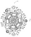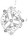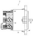 半導体モジュール1201~1206は、モータケース101側の端部に、巻線用端子508を有している。この巻線用端子508は、径方向外側へ折り曲げられ、ステータ201からの取出線206に接続されている。また、半導体モジュール1201~1206は、反モータケース101側の端部に、6本の制御用端子509と、コンデンサ用端子510とを有している(図77)。コンデンサ用端子510は、径方向内側へ折り曲げられており、径方向内側に配置された導電部821に接続されている。Thesemiconductor modules 1201 to 1206 have windingterminals 508 at the end on themotor case 101 side. The windingterminal 508 is bent radially outward and connected to the lead-outline 206 from thestator 201. In addition, thesemiconductor modules 1201 to 1206 have sixcontrol terminals 509 andcapacitor terminals 510 at the end on the side opposite to the motor case 101 (FIG. 77). Thecapacitor terminal 510 is bent inward in the radial direction, and is connected to aconductive portion 821 disposed on the inner side in the radial direction.