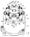 ステータ201は、モータケース101の径内方向に突出する12個の突極202を有している。この突極202は、モータケース101の周方向に所定間隔で設けられている。突極202は、磁性材料の薄板を積層してなる積層鉄心203と、積層鉄心203の軸方向外側に嵌合するインシュレータ204とを有している。このインシュレータ204には、巻線205が巻回されている。巻線205へ電流を供給するための取出線206は、巻線205の6箇所から引き出されている。巻線205は、取出線206への電流供給の態様によって、U相、V相、及び、W相の三相巻線として機能する。この意味で、巻線205が、U相、V相、及び、W相の三相巻線を構成している。取出線206は、モータケース101の軸方向端部に設けられた6つの穴から電子回路側へ引き出されている。Thestator 201 has twelve salient poles 202 projecting inwardly of themotor case 101. The salient poles 202 are provided at predetermined intervals in the circumferential direction of themotor case 101. The salient pole 202 has alaminated iron core 203 formed by laminating thin plates of magnetic material, and an insulator 204 fitted to the outside of thelaminated iron core 203 in the axial direction. A winding 205 is wound around the insulator 204. Leadwires 206 for supplying current to the winding 205 are drawn from six locations of the winding 205. The winding 205 functions as a U-phase, V-phase, and W-phase three-phase winding depending on the manner of current supply to the lead-outline 206. In this sense, the winding 205 constitutes a U-phase, V-phase, and W-phase three-phase winding. The lead-outline 206 is led out to the electronic circuit side from six holes provided at the axial end of themotor case 101.
