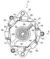 ヒートシンク621に対し、半導体モジュール511~516は、径外方向を向く側壁面625に配置されている。ここで、半導体モジュール511~516は、その放熱面が側壁面625に接触するように配置されている。このとき、側壁面625は円柱外周面であり、凸曲面で構成されている。これに合わせて、半導体モジュール511~516の放熱面は凹曲面となっている。With respect to theheat sink 621, thesemiconductor modules 511 to 516 are arranged on theside wall surface 625 facing the radially outward direction. Here, thesemiconductor modules 511 to 516 are arranged such that their heat radiation surfaces are in contact with the side wall surfaces 625. At this time, theside wall surface 625 is a cylindrical outer peripheral surface, and is configured by a convex curved surface. Accordingly, the heat radiation surfaces of thesemiconductor modules 511 to 516 are concave curved surfaces.