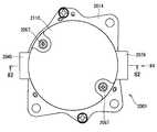 図88に示すように、制御端子2064は、モールド部2061の幅広面に垂直な面である第1の面2062に形成される。また、パワー端子2065は、モールド部2061の幅広面に垂直な面であって、第1の面2062と対向する第2の面2063に形成される。本実施形態では、パワーモジュール2060は、制御端子2064が形成される第1の面2062が制御回路基板2040側、パワー端子2065が形成される第2の面2063がパワー回路基板2070側となるようにヒートシンク2050の受熱面2059に沿って配置される。すなわち、パワーモジュール2060は、モータ2002の径方向においてヒートシンク2050の外側に縦配置される。また、パワーモジュール2060の制御端子2064及びパワー端子2065は、軸方向に視ると、シャフト2035の中心を基準にして点対称となっている。88, thecontrol terminal 2064 is formed on thefirst surface 2062 which is a surface perpendicular to the wide surface of themold part 2061. Thepower terminal 2065 is formed on asecond surface 2063 that is perpendicular to the wide surface of themold portion 2061 and faces thefirst surface 2062. In the present embodiment, thepower module 2060 has afirst surface 2062 on which thecontrol terminals 2064 are formed on thecontrol circuit board 2040 side, and asecond surface 2063 on which thepower terminals 2065 are formed on thepower circuit board 2070 side. Theheat sink 2050 is disposed along theheat receiving surface 2059. That is, thepower module 2060 is vertically arranged outside theheat sink 2050 in the radial direction of themotor 2002. Further, thecontrol terminal 2064 and thepower terminal 2065 of thepower module 2060 are point-symmetric with respect to the center of theshaft 2035 when viewed in the axial direction.