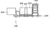 パワーユニット2105を構成するチョークコイル2076、平滑コンデンサ2077及び電解コンデンサ2078、パワーコネクタ2079は、ヒートシンク2050の連結部2052とパワー回路基板2070との間であって2つの放熱ブロック2051の間に形成される空間に配置される。また、これらの電子部品は、制御回路基板2040に接続される制御コネクタ2045側から、チョークコイル2076、平滑コンデンサ2077及び電解コンデンサ2078、パワーコネクタ2079がこの順で直線的に配列される。Thechoke coil 2076, the smoothingcapacitor 2077, theelectrolytic capacitor 2078, and thepower connector 2079 constituting thepower unit 2105 are formed between the connectingportion 2052 of theheat sink 2050 and thepower circuit board 2070 and between the two heat dissipation blocks 2051. Arranged in space. In addition, in these electronic components, achoke coil 2076, a smoothingcapacitor 2077, anelectrolytic capacitor 2078, and apower connector 2079 are linearly arranged in this order from thecontrol connector 2045 side connected to thecontrol circuit board 2040.