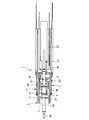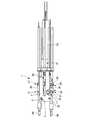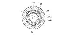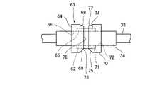 第1ガイド64は、図21に示すように、内周面が大径部65と小径部66の2段に形成され、小径部66の内周側に外筒36を挿通させ、大径部65の内周側にワイヤ取付部62の前方側の部分を挿入させ、ワイヤ取付部62の前方側の端面を小径部66と大径部65との境界面に当接させることにより、ワイヤ取付け部62の前方側の部分の外周側に相対回転可能に取り付けられる。As shown in FIG. 21, thefirst guide 64 has an inner peripheral surface formed in two stages of alarge diameter portion 65 and asmall diameter portion 66, and theouter cylinder 36 is inserted into the inner peripheral side of thesmall diameter portion 66, so that the large diameter portion Thewire attachment portion 62 is inserted by inserting the front portion of thewire attachment portion 62 into the inner peripheral side of thewire 65 and bringing the end surface on the front side of thewire attachment portion 62 into contact with the boundary surface between thesmall diameter portion 66 and thelarge diameter portion 65. It is attached to the outer peripheral side of the front portion of theportion 62 so as to be relatively rotatable.