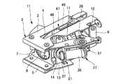 スライド部材47の前部材48の上下端部には、上方及び下方に突出する突出部49、49が一体に設けられ、上側の突出部49をフレーム2の上板3の中央部に設けられているスライド溝4内に係合させ、下側の突出部49をフレーム2の下板5の中央部に設けられているスライド溝6内に係合させることにより、スライド部材47がフレーム2の長手方向に前進後退可能に支持される。The upper and lower ends of thefront member 48 of theslide member 47 are integrally provided withprotrusions 49 and 49 protruding upward and downward, and theupper protrusion 49 is provided at the center of theupper plate 3 of theframe 2. Theslide member 47 is engaged with theslide groove 4 provided in the center portion of thelower plate 5 of theframe 2, so that theslide member 47 extends in the longitudinal direction of theframe 2. Supported to be able to move forward and backward in the direction.
