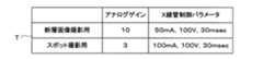 記憶部23には、アナログゲインとX線管3の制御に関するパラメータとが関連付けられたテーブルTが記憶されている(図4参照)。スポット撮影用のX線管3の制御に関する各パラメータは、スポット撮影用のアナログゲインと関連付けられている。断層撮影用のX線管3の制御に関する各パラメータは、断層撮影用のアナログゲインと関連付けられている。断層撮影用のアナログゲインの値は、スポット撮影用のそれよりも高い値となっている。また、断層撮影はスポット撮影よりも低出力のX線が出力されるようにX線管3の制御に関する各パラメータが規定されている。パラメータは、具体的にX線管3の管電流、管電圧、パルス幅(X線ビームの1パルスあたりの照射時間)である。パラメータを上述の構成とすることで、断層撮影における単発のX線パルスが被検体に当たったときの被曝量は、スポット撮影におけるそれよりも低く抑えられている。なお、断層撮影においては、X線パルスが被検体に74回照射されることになる。Thestorage unit 23 stores a table T in which analog gains and parameters related to control of theX-ray tube 3 are associated (see FIG. 4). Each parameter related to the control of theX-ray tube 3 for spot imaging is associated with an analog gain for spot imaging. Each parameter related to the control of theX-ray tube 3 for tomography is associated with an analog gain for tomography. The analog gain value for tomography is higher than that for spot imaging. In the tomography, parameters related to the control of theX-ray tube 3 are defined so that X-rays with a lower output than spot imaging are output. The parameters are specifically the tube current, tube voltage, and pulse width of the X-ray tube 3 (irradiation time per pulse of the X-ray beam). By setting the parameters as described above, the exposure dose when a single X-ray pulse in tomography hits the subject is suppressed to be lower than that in spot imaging. In tomography, the subject is irradiated 74 times with X-ray pulses.
