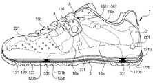 도 6은 본 발명에 의한 신발의 깔창 및 밑창 부분을 도시한 분해사시도이다.Figure 6 is an exploded perspective view showing the insole and the sole portion of the shoe according to the present invention.