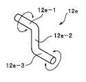 この保持部材12eは、図11に示すように第1水平軸12e-1と、同第1水平軸12e-1の一端で90°屈曲する屈曲軸12e-2と、同屈曲軸12e-2の他端で前記第1水平軸12e-1と平行で且つ前記屈曲軸12e-2を挟んで前記第1水平軸12e-1と反対方向に伸びる第2水平軸12e-3とからなるクランク軸と同様の形状及び構造を備えており、前記第1水平軸12e-1が上記トウ振込みシュート6の揺動中心を中心として、前記トウ振込みシュート6の上記トウ振出し口6aまでの寸法を越えた半径を有する同心円上を前記第2水平軸12e-3が回転する。このときの半径は、前記トウ振込みシュート6が梱包容器4の開口部上方に位置したとき、前記保持部材12eの回転によっても、前記第2水平軸12e-3が梱包容器4と干渉しない寸法とされている。As shown in FIG. 11, the holdingmember 12e includes a firsthorizontal shaft 12e-1, abent shaft 12e-2 bent at 90 ° at one end of the firsthorizontal shaft 12e-1, and abent shaft 12e-2. A crankshaft comprising a secondhorizontal shaft 12e-3 extending at the other end in parallel to the firsthorizontal shaft 12e-1 and extending in a direction opposite to the firsthorizontal shaft 12e-1 across the bendingshaft 12e-2; The firsthorizontal shaft 12e-1 has the same shape and structure, and the radius of the firsthorizontal shaft 12e-1 exceeds the dimension of thetoe transfer chute 6 to thetoe outlet 6a with the swing center of thetow transfer chute 6 as the center. The secondhorizontal shaft 12e-3 rotates on a concentric circle having The radius at this time is such that the secondhorizontal shaft 12e-3 does not interfere with thepackaging container 4 even when the holdingmember 12e rotates when thetoe transfer chute 6 is positioned above the opening of thepackaging container 4. Has been.