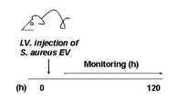 도 22는 황색 포도상구균 유래 세포밖 소포체에 의한 파종성혈관내응고증 동물 모델의 프로토콜이다.FIG. 22 is a protocol of a disseminated intravascular coagulation animal model with Staphylococcus aureus-derived extracellular vesicles.
